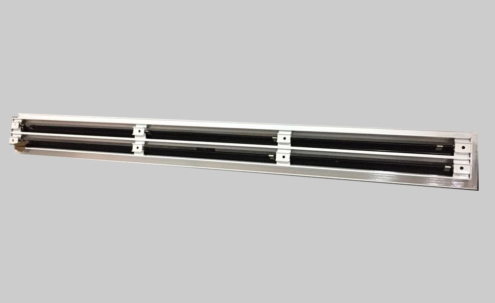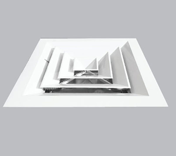 Difusor cuadrado con templador de aletas opuestas galvanizadas. Inyección de aire en 4 vías, construcción de aluminio. Tamaños desde 150 x 150 a 500 x 500 mm. Color blanco.